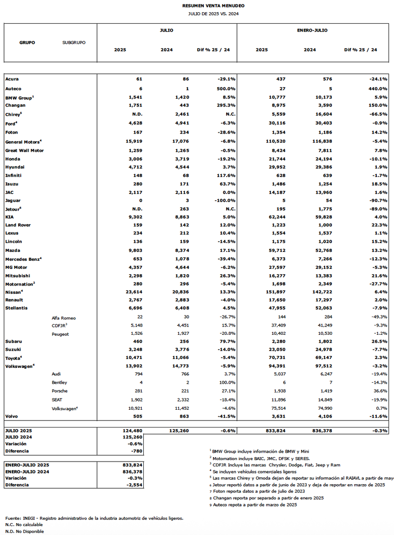 De acuerdo con las cifras publicadas por el INEGI, en julio de 2025 la venta de vehículos ligeros nuevos fue de 124,480 unidades, 0.6% menor al número de unidades comercializadas en julio de 2024. En el periodo enero-julio de 2025 se registraron 833,824 vehículos ligeros nuevos vendidos, lo que representa una disminución de -0.3% con respecto a lo reportado durante el mismo periodo de 2024.