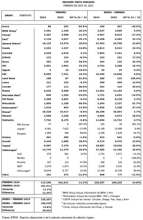 De acuerdo con las cifras publicadas por el INEGI, en febrero de 2024 la venta de vehículos ligeros nuevos fue de 113,258 unidades, 11.1% mayor al número de unidades comercializadas en febrero de 2023.