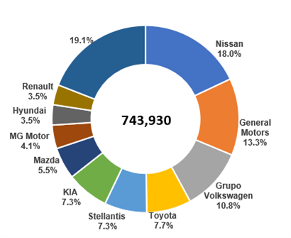 Nota: Grupo Volkswagen considera Audi, Bentley, Porsche, Seat y Volkswagen. Stellantis incluye Alfa Romeo, Chrysler, Dodge, Fiat, Jeep, Peugeot y Ram. Fuente: INEGI – Registro administrativo de la industria automotriz de vehículos ligeros.
