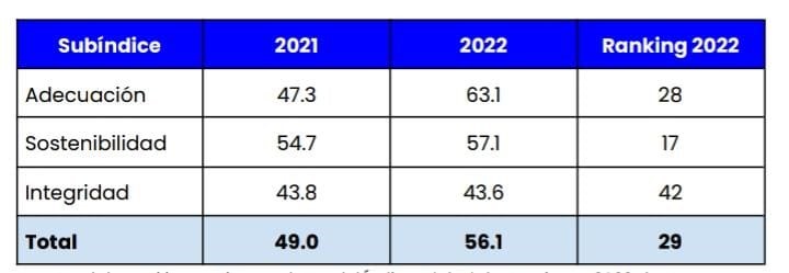 México es el país que más puntos subió comparado con el año pasado: pasamos de un puntaje global de 49.0 en 2021 a 56.1 en 2022. Esto nos colocó en el lugar 29 de 44 —comparado con 37 de 43 el año pasado— en el ranking de los países analizados. En general, un muy buen avance.